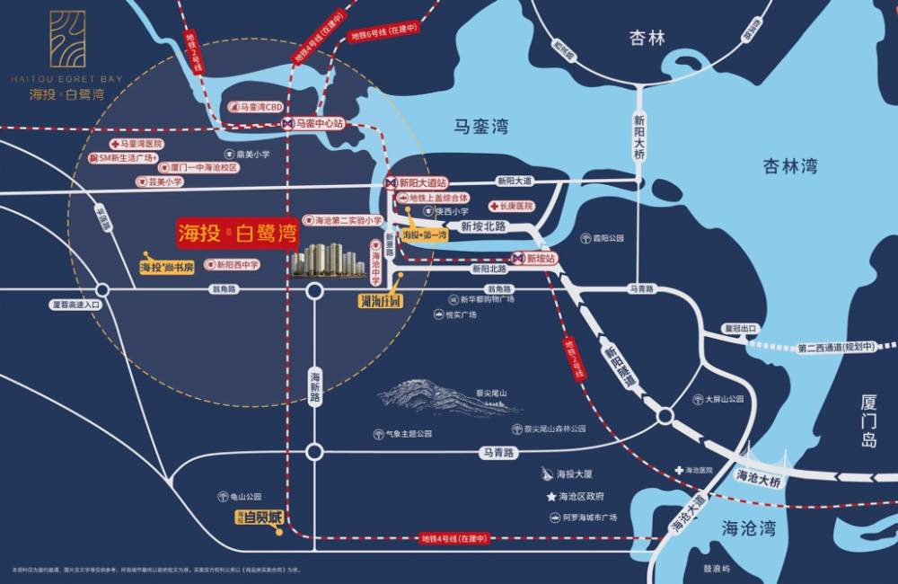 海投白鹭湾位于海沧区灌新路与新景西路交叉口东北侧,离地铁2号线新阳大道站约1公里,交通便捷,出行无忧啊!
