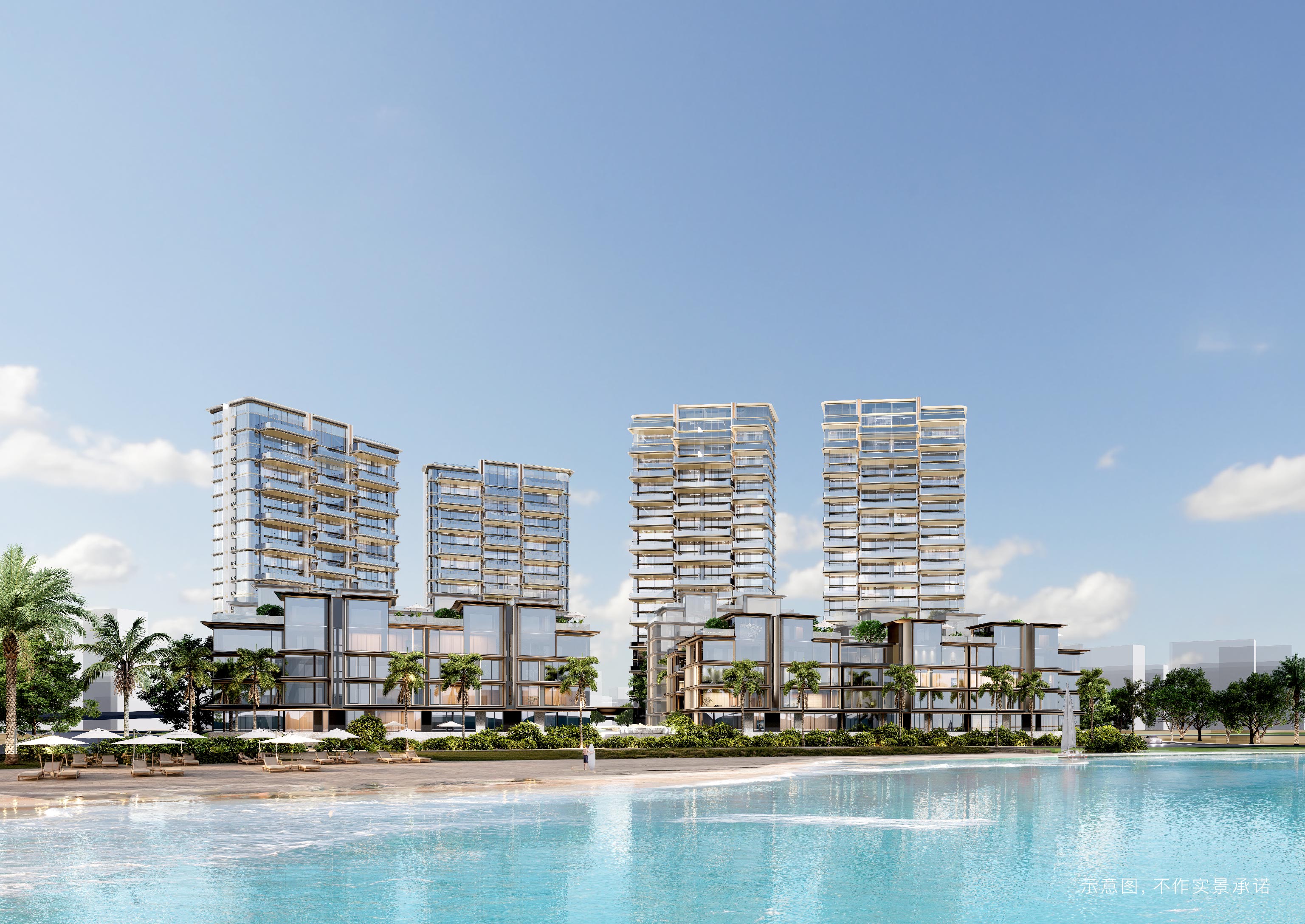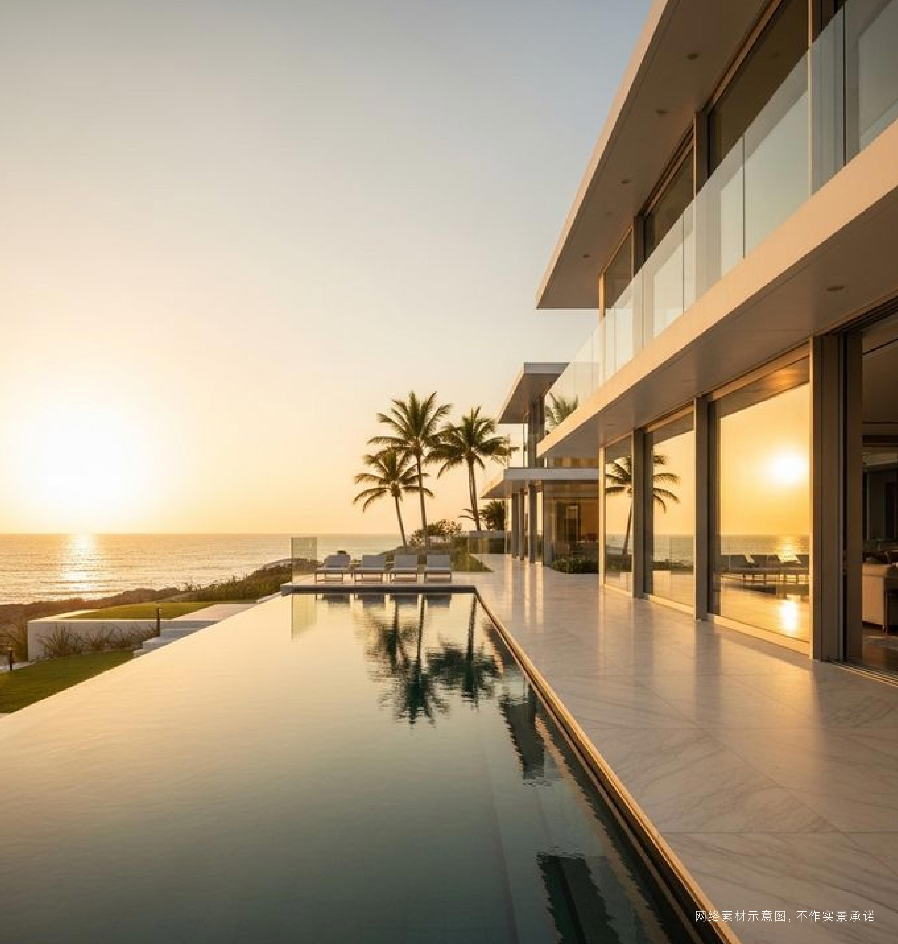 项目自带下沉式会所和标配泳池,内部园林与外部湾海景观呼应,打造"社区即度假"的氛围。更难得的是,陆拾岛的景观拒绝"效果图式"营销,目前项目实景已逐步呈现,沙滩、湾海、建筑立面的质感都可实地感受。